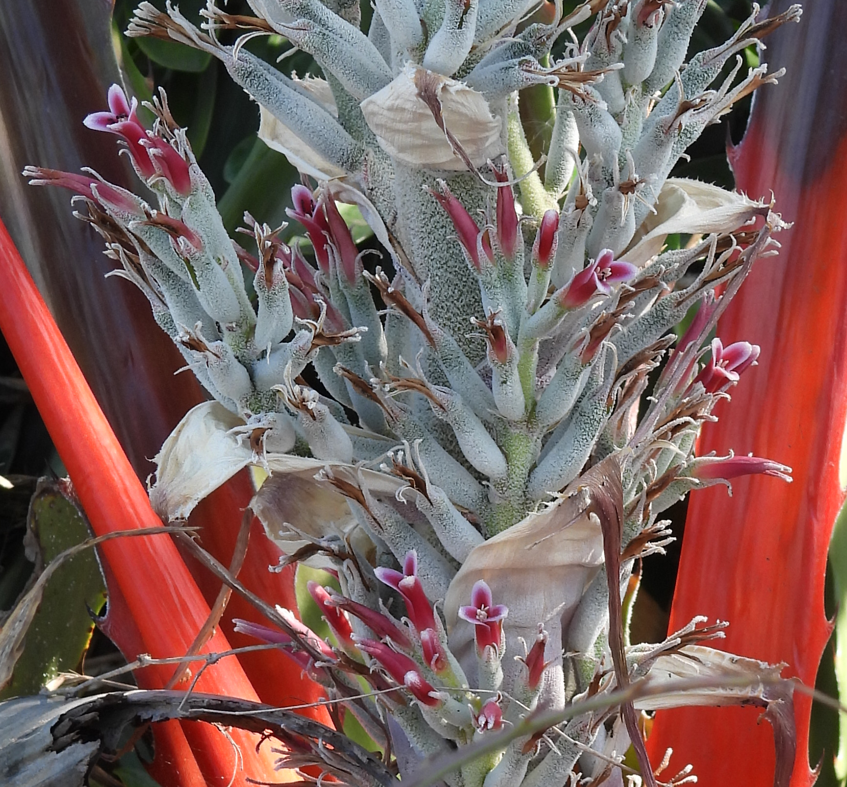 The complete, perfect, slightly zygomorphic flowers, each with a subtending bract, are arranged in a white, tomentose, spikelike panicle. The lower bracts below the inflorescence are bright red colored. The flowers have 3 white tomentose fused sepals in the calyx that exceed the length of the bracts. There are 3 red with white margins, fused at the base petals in the corolla that are longer than the calyx.  There are 6 stamens that are equal in length and adnate to the petals.  The ovary is inferior with 3 locules and numerous seeds.  The fruit is a yellow berry at maturity.