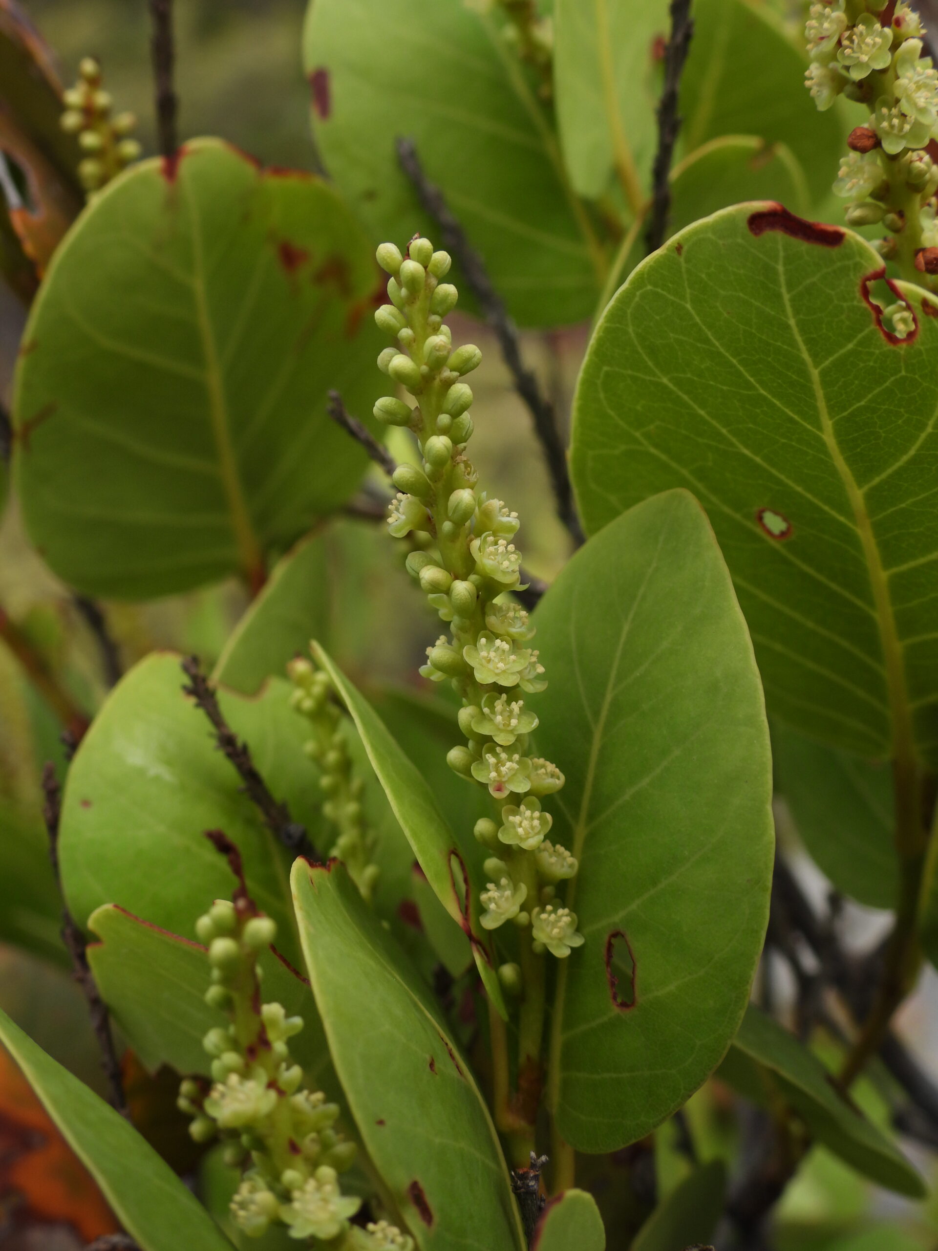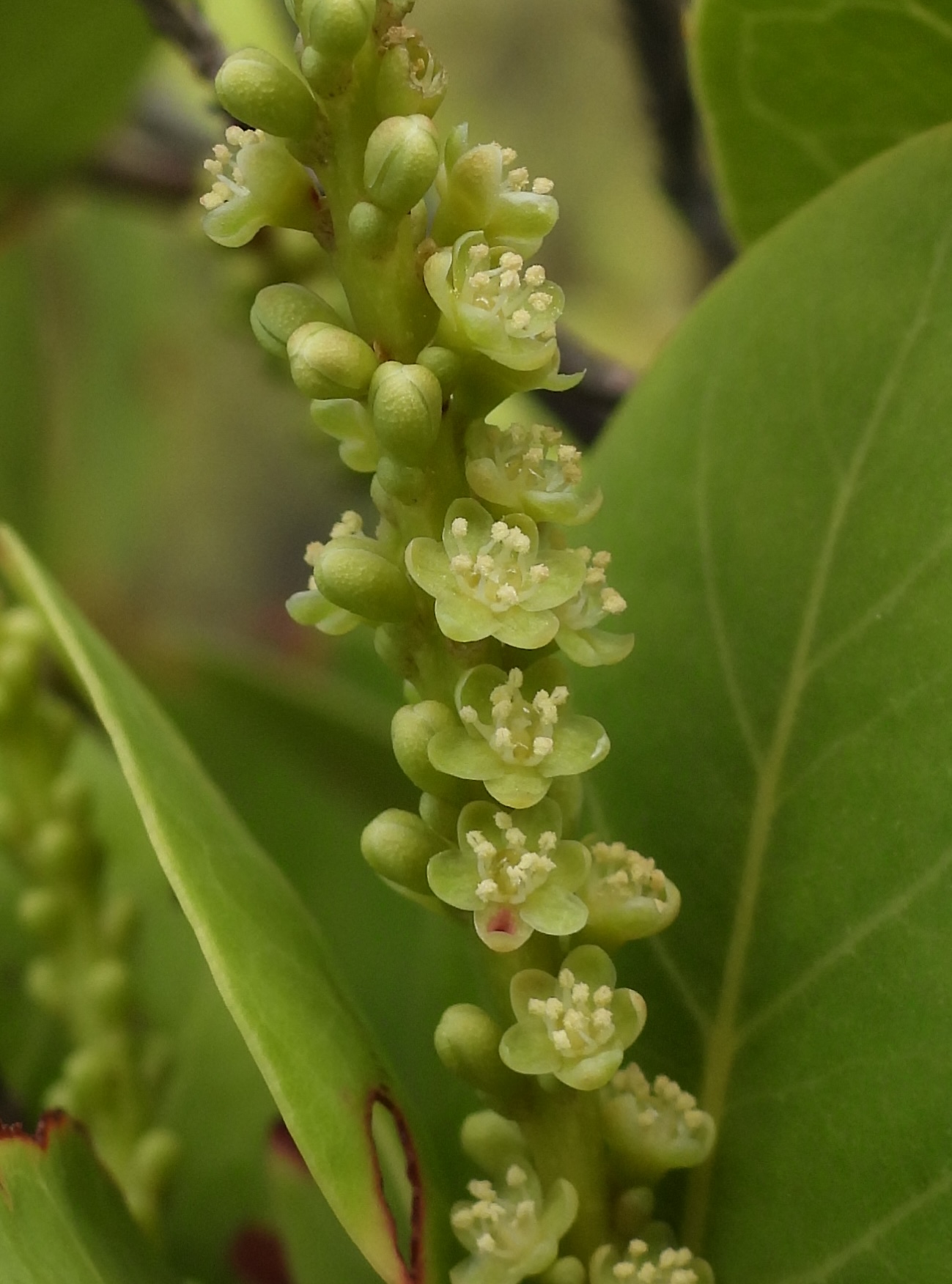 Habit: Coccoloba krugii grows as a shrub to small tree to 9 meters in height. The leaves are arranged alternately, to 7 cm in length, ovate with a rounded leaf apex and entire margin, and are slightly coriaceous. There is a small deciduous sheathing ocrea extending from the petiole surrounding the stem above the internode when there are new leaves.