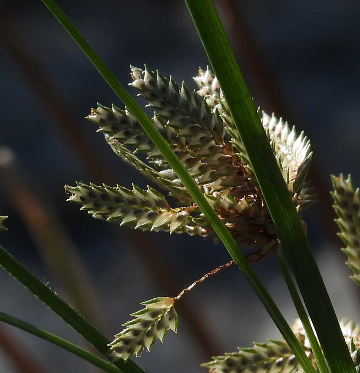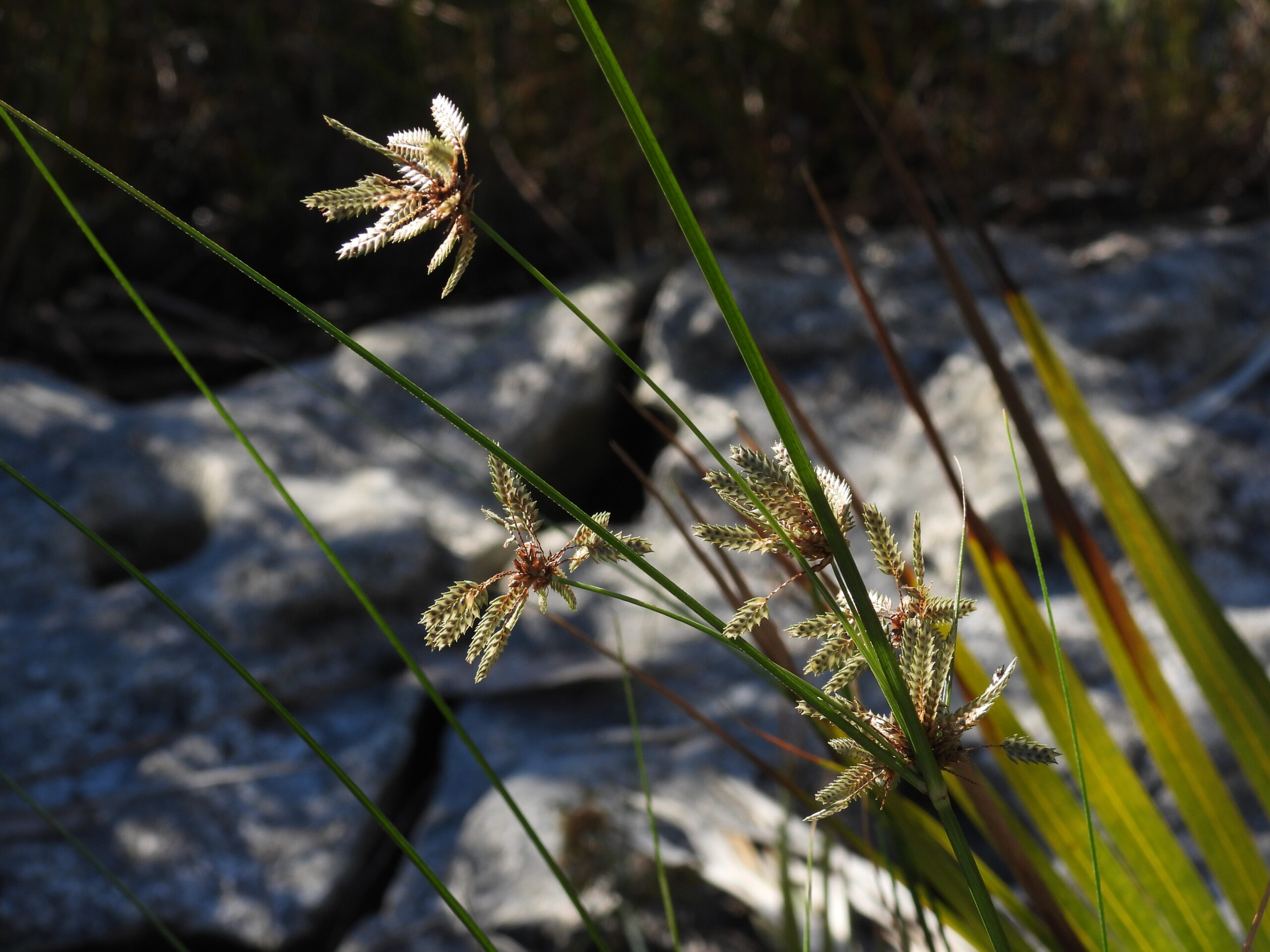 The incomplete, perfect flowers are arranged in a cluster of 6-12 flattened spikelets in an open panicle. The spikelets are at the end of a triangular shaped peduncle and are subtended by 3 – 7 leaf like bracts to 15 cm in length.  The spikelets are clear and green at maturity, to 3 cm in length. Each spikelet has 20-30 flowers with a zig-zag rachis. The flowers are subtended by an ovate brown bract. There is no calyx or corolla. There are 2 – 3 stamens. The ovary is superior with a single locule with a 2-parted style. The fruit is a oblong achene at maturity.