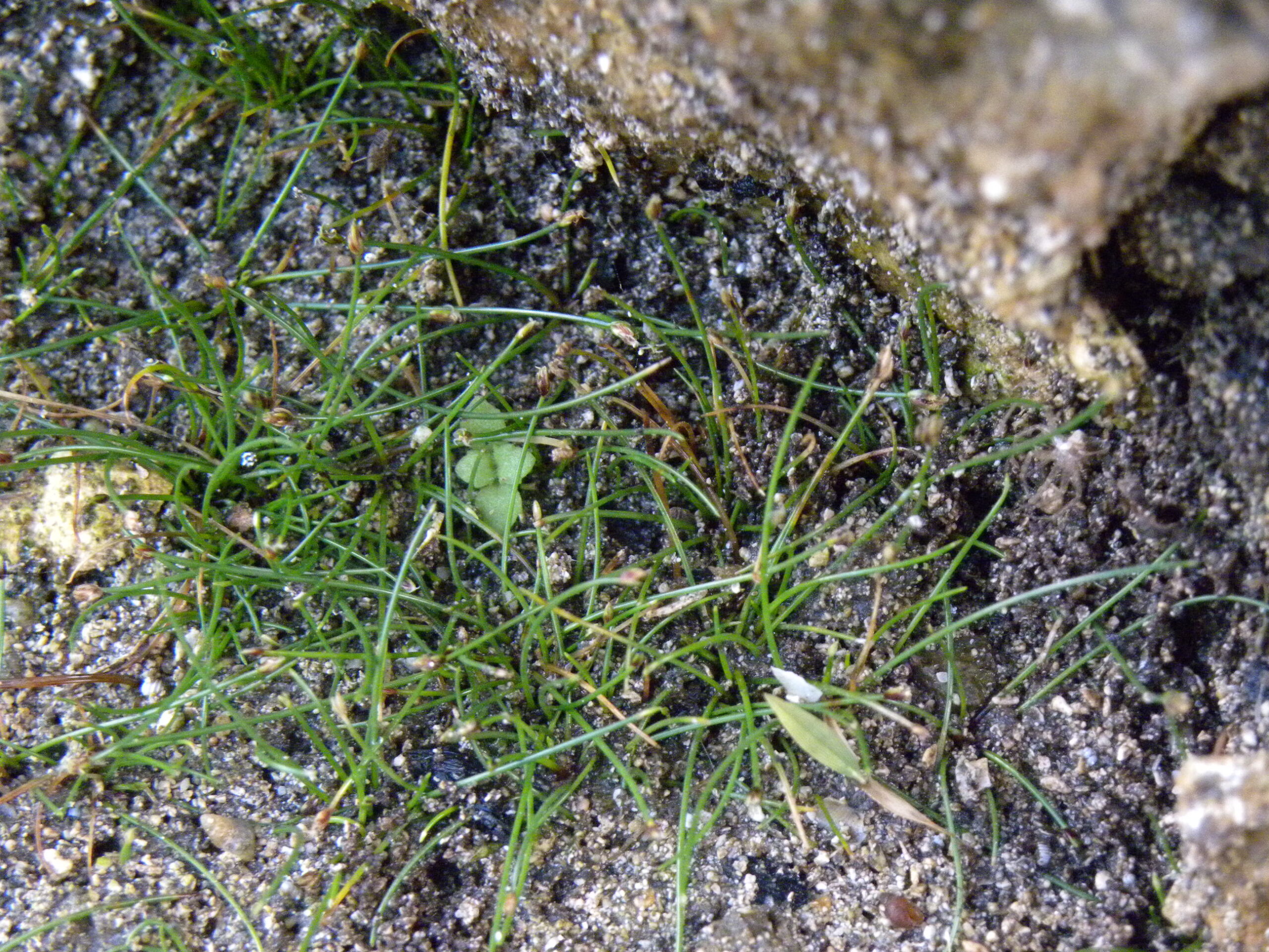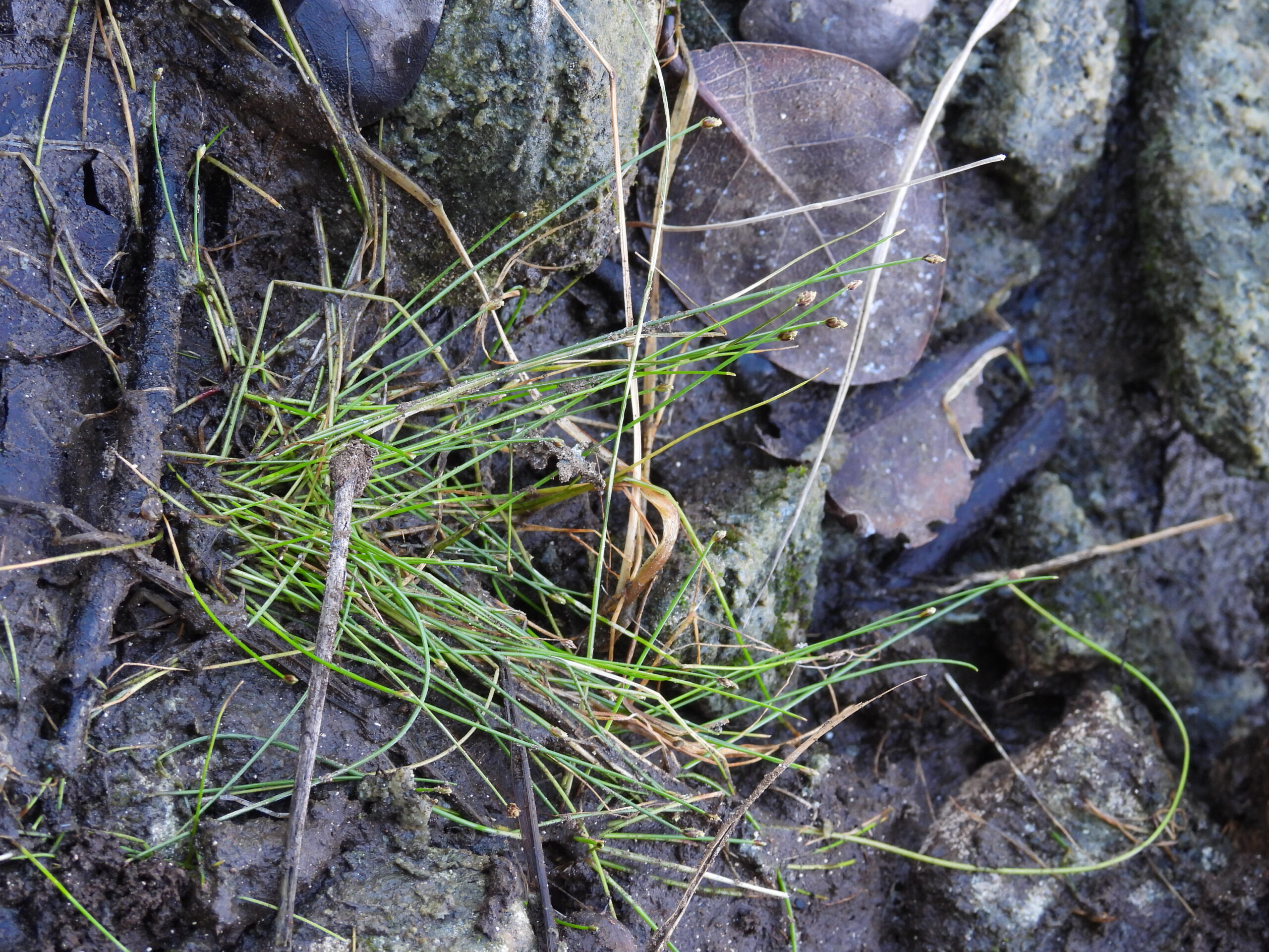 Habit: Eleocharis bahamensis grows as a clumping herb that produces rhizomes. The stems are round, to less than 8 cm in height, and to 2 mm wide. The leaves are reduced to a reddish sheath with an apiculate tip at the base of the stem.