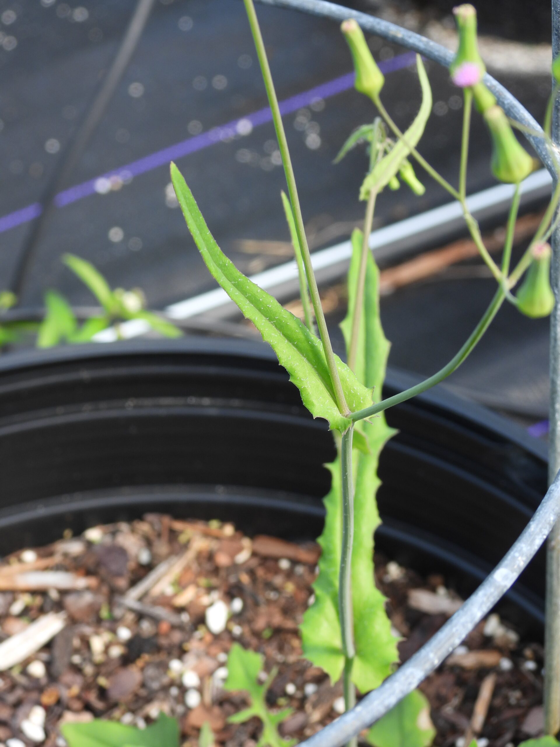 Habit: Emilia sonchifolia grows as an herbaceous annual to about 75 cm in height (usually much shorter) when in flower. The leaves are arranged alternately, to 18 cm in length and without petioles; sagittately clasping to the stem. The leaves are obovate to oblanceolate with an acute or obtuse leaf apex and toothed to lobed margin. The leaves have a sparse covering of pubescence.