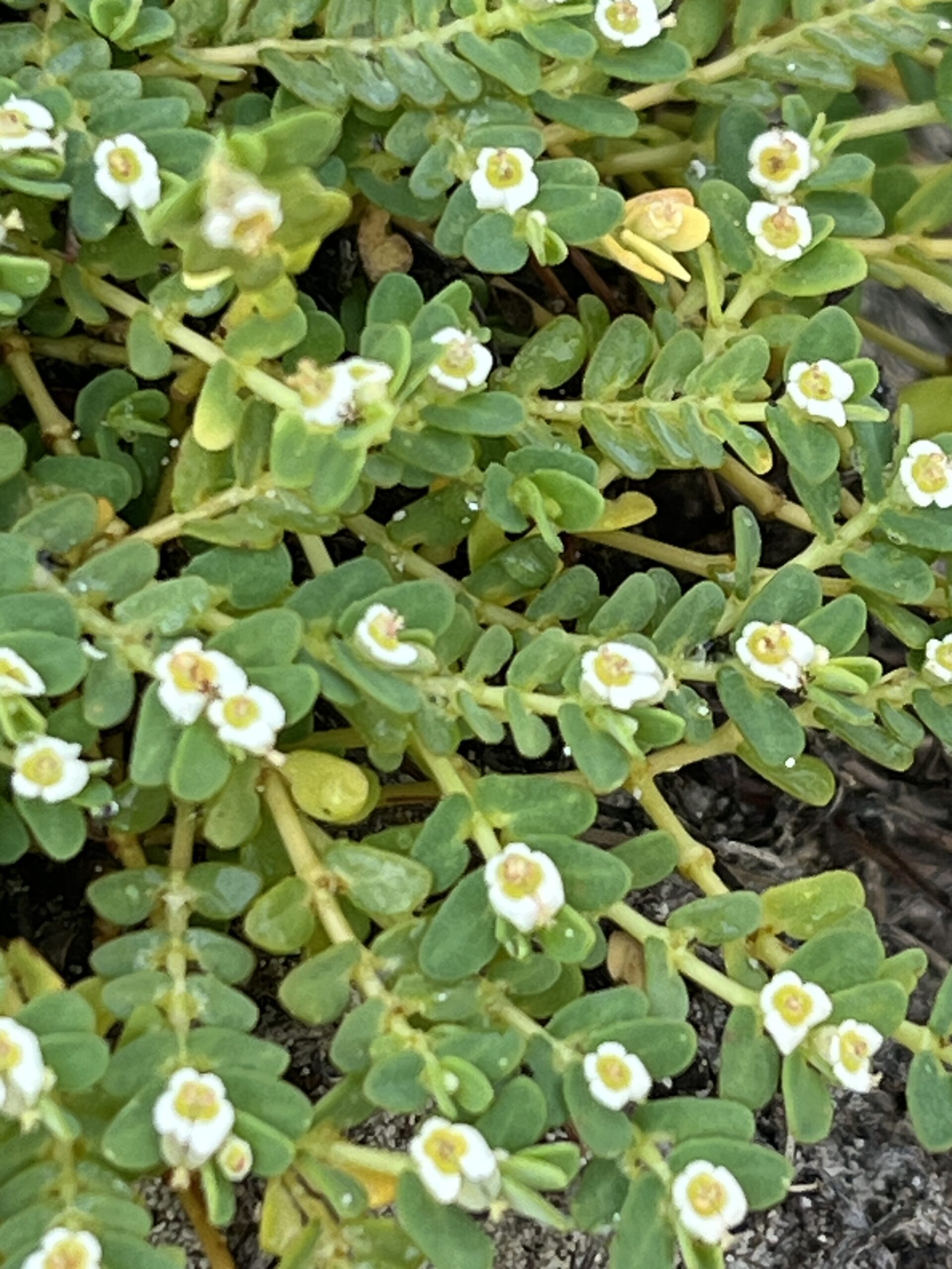Habit: Euphorbia centunculoides grows as erect/ascending semi-succulent, glabrous perennial to 15 cm in height (typically shorter) forming mounds. The leaves are arranged oppositely, ovate to suborbicular, to 5 mm in length with an acute to round leaf apex and entire leaf margin. At the base of the petiole are 2 round to lanceolate, entire to divided, stipules. The vegetation produces a thick, milky sap.