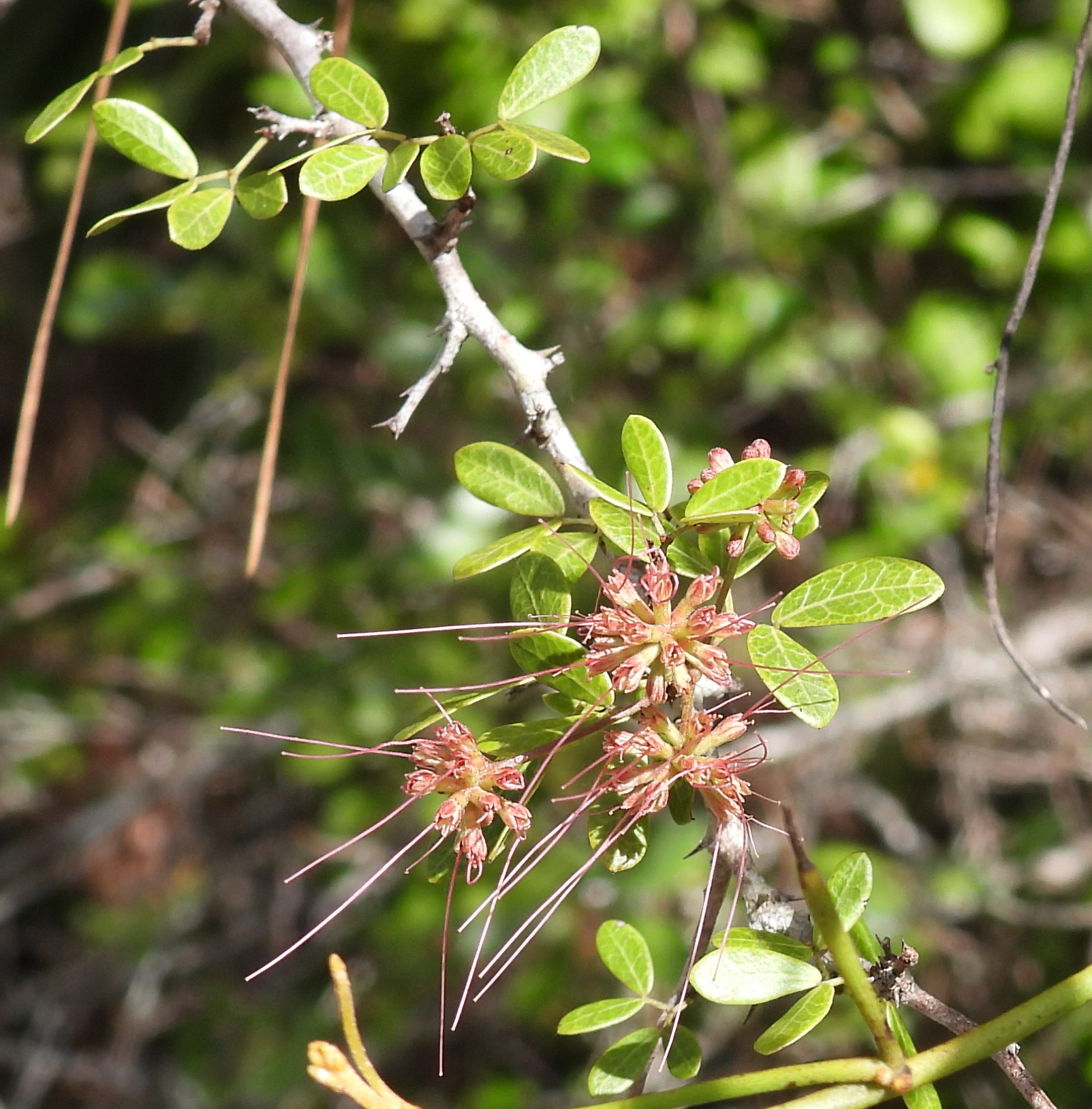 Habit: Pithecellobium hystrix grows as a slightly pubescent shrub to small multi-trunked tree up to 4 m in height (usually 1-2 m.) The leaves are arranged alternately, bipinnately compound, to 4 cm in length, with 2 pinnae each with two subleaflets. The petiole has a round gland between the pinnae. Subleaflets obovate to 2 cm long with an obtuse leaf apex and entire margin. At the base of each leaf are stipular spines up to 2 cm long. Foliage often with a. reddish tinge.