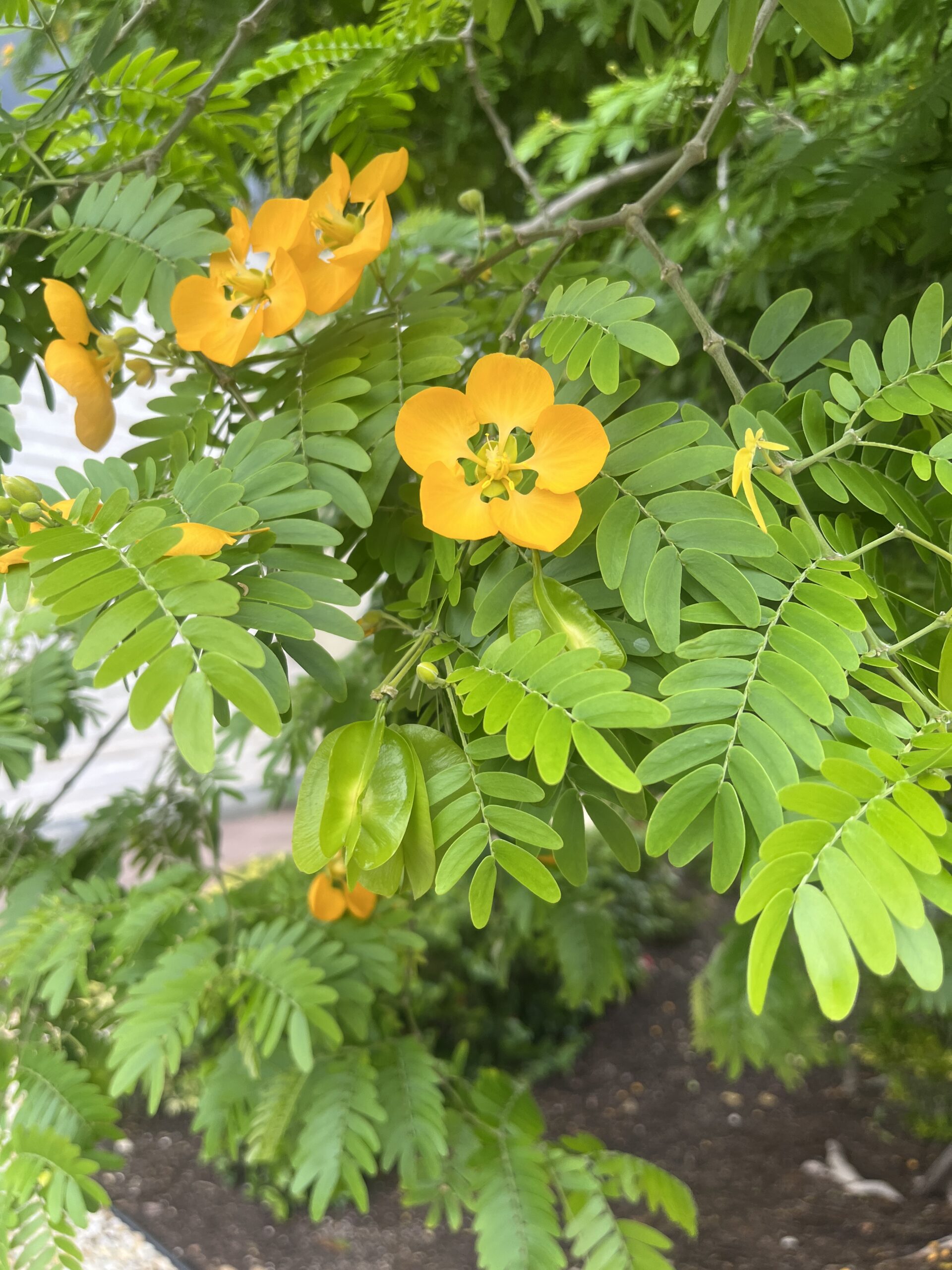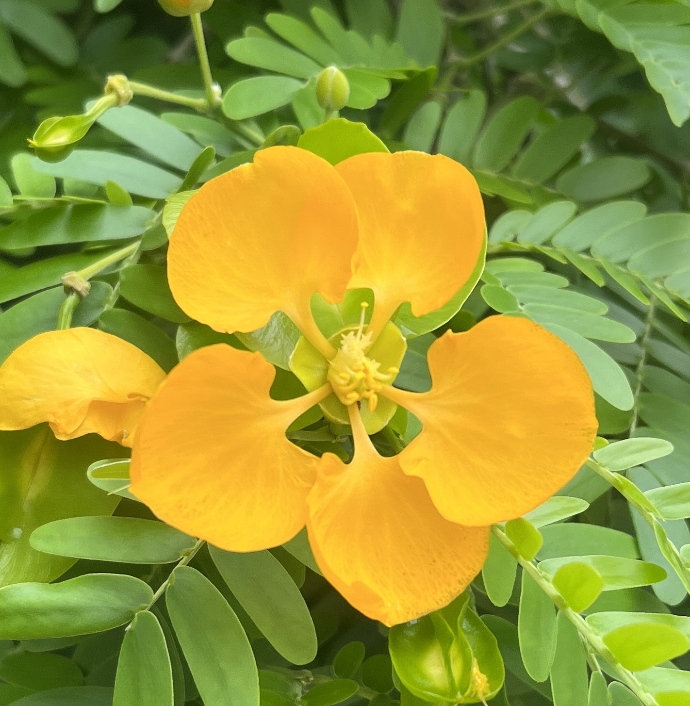The complete, perfect, actinomorphic, flowers are arranged solitarily in leaf axils. The calyx has five unfused sepals. The corolla has 5 unfused, clawed petals that are orange/yellow. The fruit is a multi-, wavy-winged capsule.